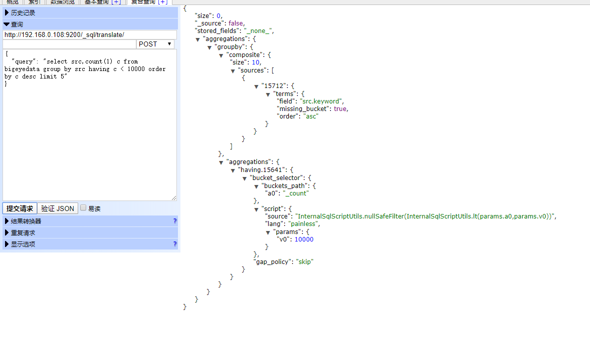 curl -XPOST "192.168.0.108:9200/_sql?format=txt&pretty" -H 'Content-type: application/json' -d'