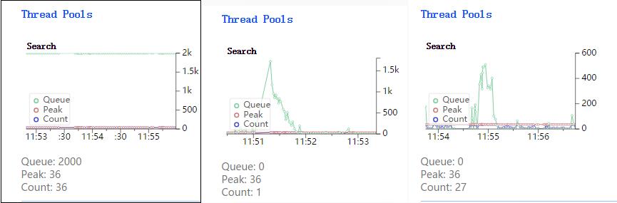 这是一组es集群,3个节点配置一样,都是数据节点,也可以被选为主节点。但是发现节点1的搜索请求一直在堆积,而节点2和节点3的搜索请求并不多,这样导致节点1的请求队列超过设置的2000容量,则后续请求都被拒绝了。